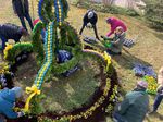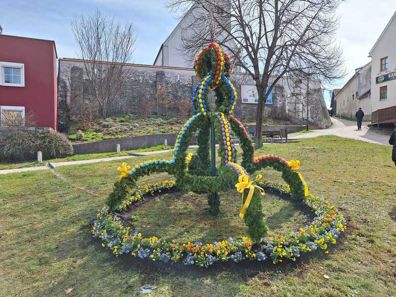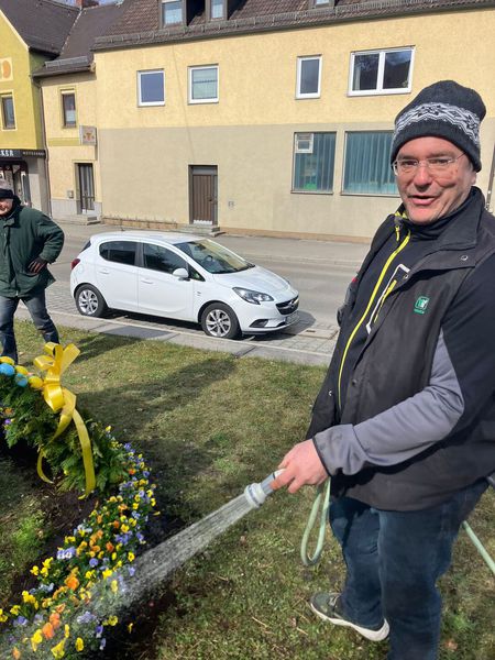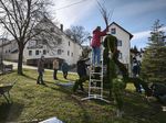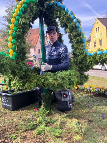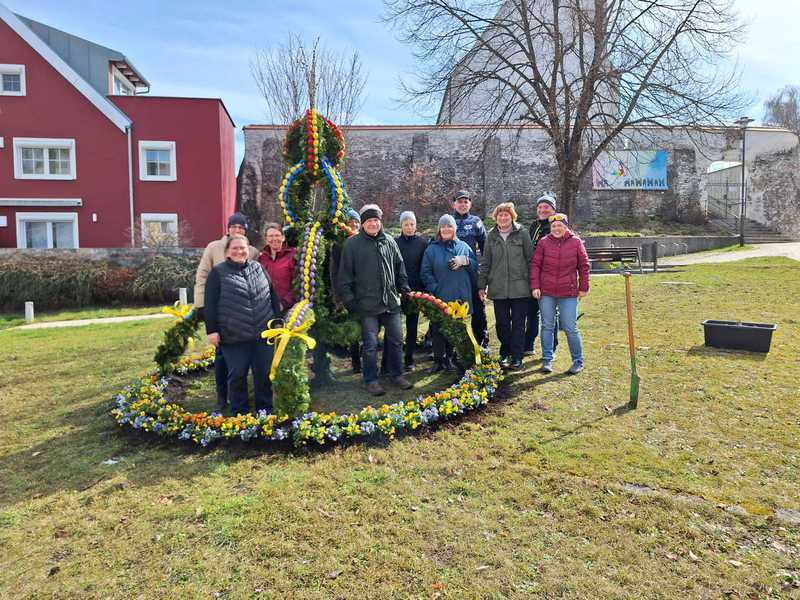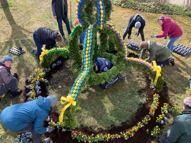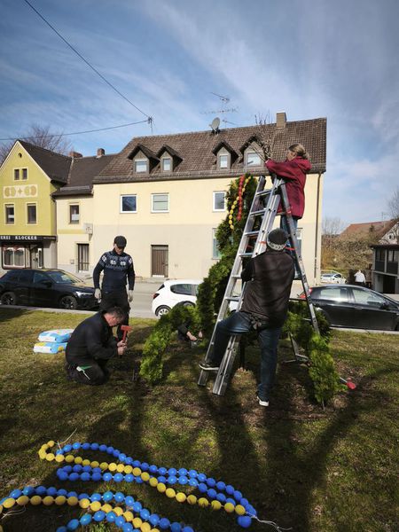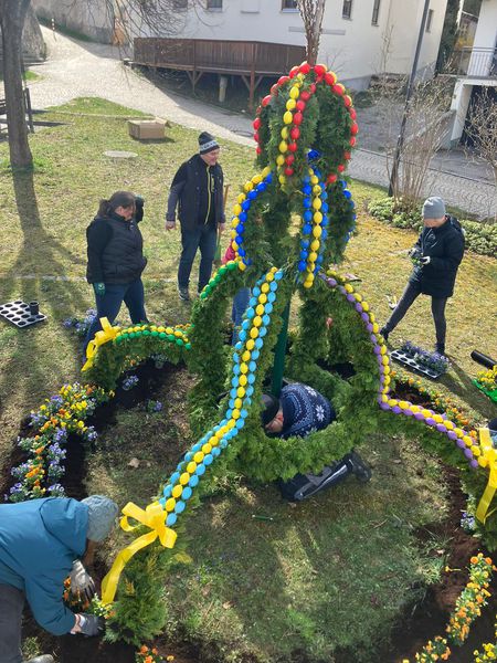 Mit vereinten Kräften haben wir unsere schöne Osterkrone auch dieses Jahr wieder gebunden und aufgebaut.
