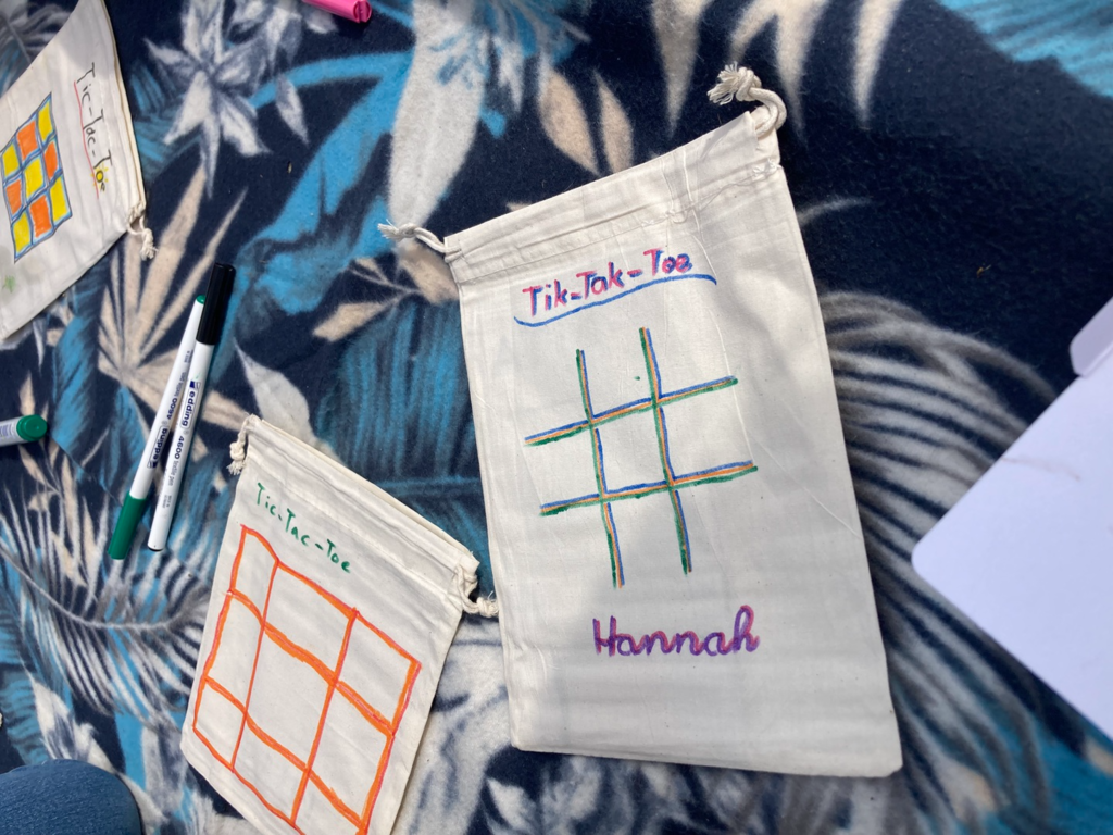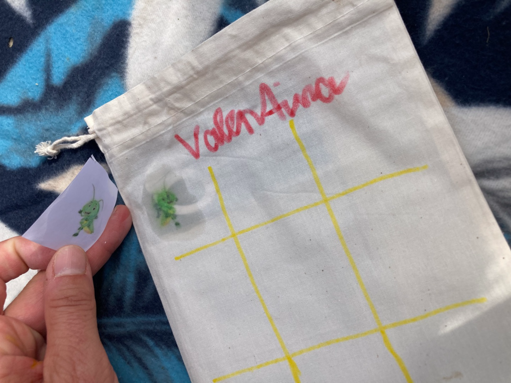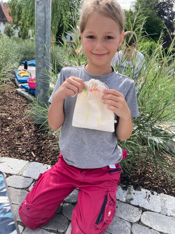 Nach dem Obstpicknick gestalen wir noch ein Reise-Spiel für die Sommerferien, mit Lavandelöl drucken wir unser Grashüpfer-Logo auf Stoffsäckchen und schaffen so die Unterlage für ein Tic-Tac-Toe Spiel.